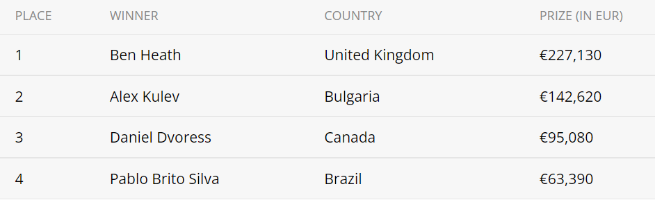 英国选手Ben Heath在2022年EPT布拉格站中的收获从目前来看,可谓是硕果累累。不仅拿下了赛事#10豪客赛的冠军,还拿下刚刚结束的赛事#13豪客赛冠军,连续两场比赛的胜利使他获得了总计500,840欧元的奖金!赛事#10:€25,000 NLHE豪客赛,22名参赛者创造了528,220欧元的总奖池。由15名独特的玩家和7名重新参赛者组成的小而精的队伍,在比赛中相互厮杀,最终以Ben Heath在单挑中击败Alex Kulev结束比赛。此次获胜使Heath获得了227,130 欧元奖金!赛事#10决赛结果: