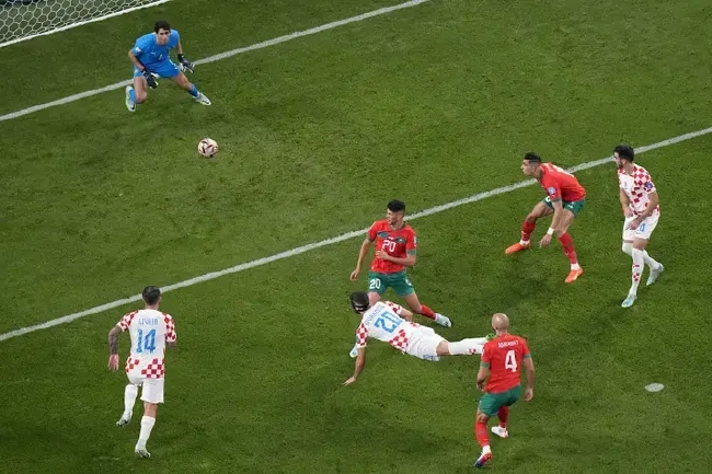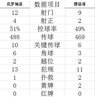 克罗地亚第7分钟取得领先,佩里西奇头球摆渡,格瓦迪奥尔10码处头球破门。摩洛哥第9分钟扳平,齐耶赫任意球传中,摩德里奇头球解围顶向本方门前,达里近距离头球破门,1-1。