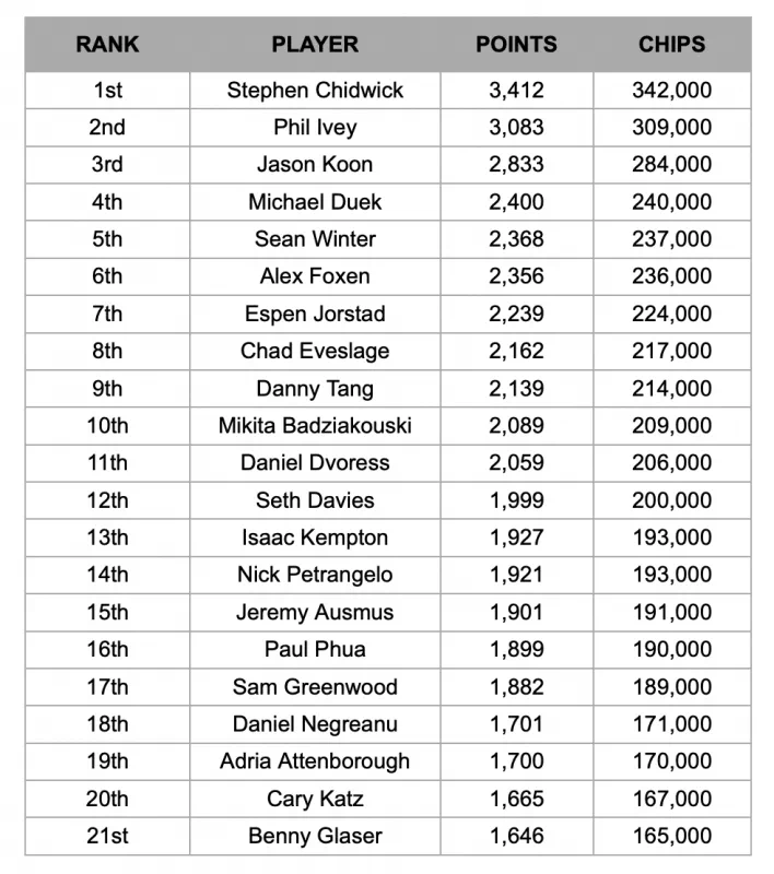参赛的21名选手通过在买入费不低于1万美元的扑克锦标赛(包括WSOP主赛事)中赚到的积分赢得邀请资格,这意味着WSOP主赛事冠军Espen Jorstad也在其中。