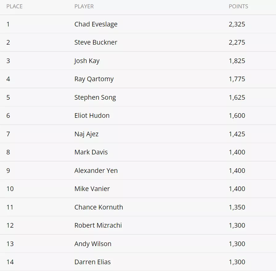 在本赛季的最后一场比赛WPT世界锦标赛期间,Chad Eveslage不得不全力以赴,如今他正以2,325分的POY积分正式成为2022年世界扑克巡回赛第20赛季的年度最佳玩家。