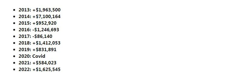他最糟糕的一年是2016年,当时他损失了1,246,693 美元。总的来说,他每年的平均利润为 1,459,695美元,总利润为13,137,263美元。