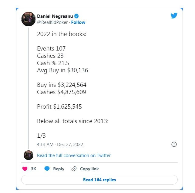 根据他自己的记录,丹牛在2022年总共参加了107场比赛,23次进入钱圈,总奖金为4,875,609 美元。