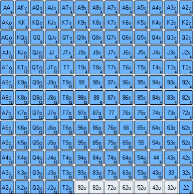 单挑玩太少的手是新玩家在SNG中最容易犯的错误。特别是来自其他变体的玩家,他们不习惯玩一个非常高的VPIP。然而,SNG的结构有利于在正面对决中使用非常高的VPIP。对于大多数记分牌大小,尽量争取超过90%。