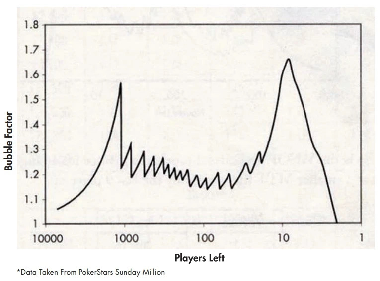 Dara O’Kearney: 泡沫系数(见图)开始时很低(但与大多数人的想法相反,开始时不是1.0),然后在奖金泡沫上陡然上升到1.6,一旦玩家进入奖励圈,就会大幅下降。然后在决赛桌前陡然上升到1.7,然后再次走下坡路,但没有那么明显,直到正面对决。
