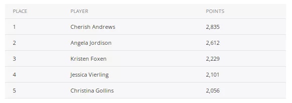 在最后一个月开始的时候,年度最佳女选手的竞争基本上只剩下两位选手–Andrews和Jordison,Jordison以2483分领先。