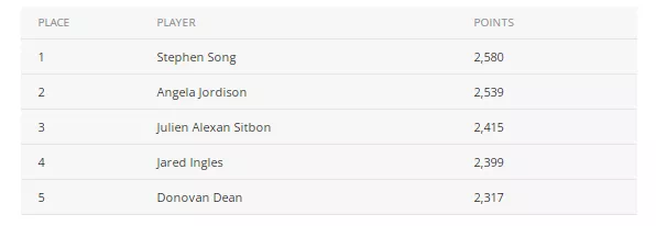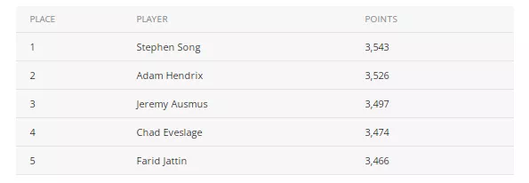 Song在总积分榜上积累的3543分仅比获得亚军的Hendrix多出17分。Stephen Chidwick 以3323分排在第十位,仅比领先者多出220分。进入12月后,有10-15名选手仍在争夺中。