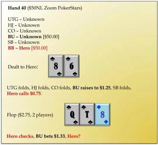 翻牌:Q♠-T♠-8♦。Hero过牌,按钮位下注$1.33,Hero应该怎么行动?