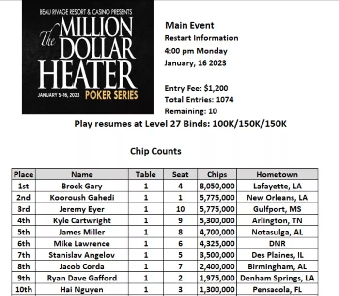 Postle将以4,325,000记分牌开始比赛,盲注将恢复为100,000/150,000,大盲注为150,000。他排在第六位,距离很近。来自路易斯安那州拉斐特的Brock Gary以8,050,000领先。