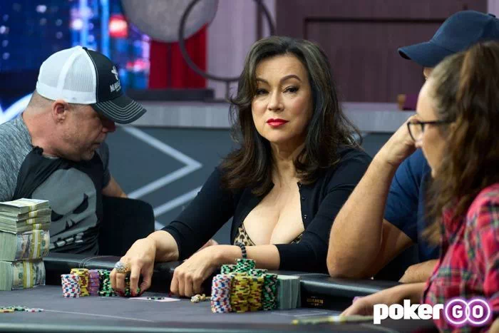 在一场盲注200/400美元的无限德州扑克现场局中,买入40万美元上桌的Eric Persson在中间位置用5♠ 5♦跟注,随后Jennifer Tilly在CO位置用7♠ 4♠加注到2000美元。
