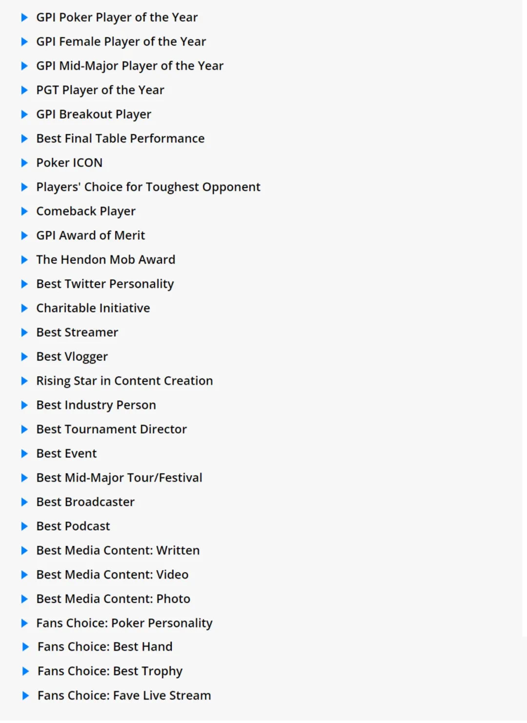 通过全球扑克指数和The Hendon Mob的新闻稿,2022年全球扑克奖的奖项已经揭晓,该奖项将于3月3日在拉斯维加斯的PokerGO工作室举行。