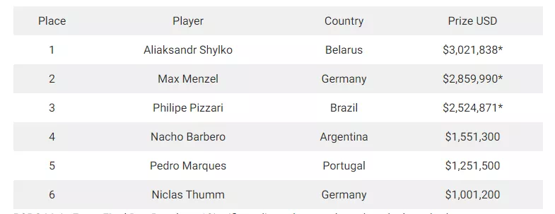 PSPC主赛事最后一天的结果 – *表示根据达成的协议调整了奖金