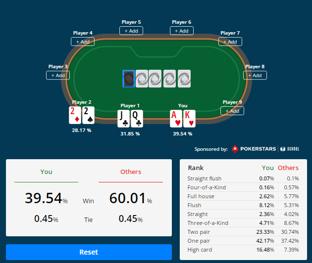 在我们的赔率计算器上,我们看到AKs获胜的概率为39%,QJs的概率为32%(显然,如果花色与 AKs相同,赢率会更低),而口袋2的胜率为28%。