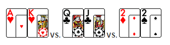 最有动力缩小竞争者数量的玩家是拥有AK的玩家,他们基本上处于抛硬币单挑的状态。持有口袋 2的玩家也有兴趣,但前提是他与持有AK的对手单挑。