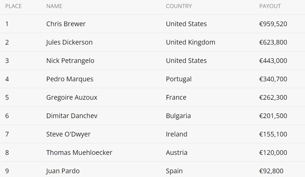 68名参赛者缔造了一个3,198,720欧元的总奖池。9人决赛桌经过一轮又一轮的淘汰后,Brewer在7个小时的单挑中击败英国选手Jules Dickerson,赢得了他职业生涯锦标赛中的最高分。