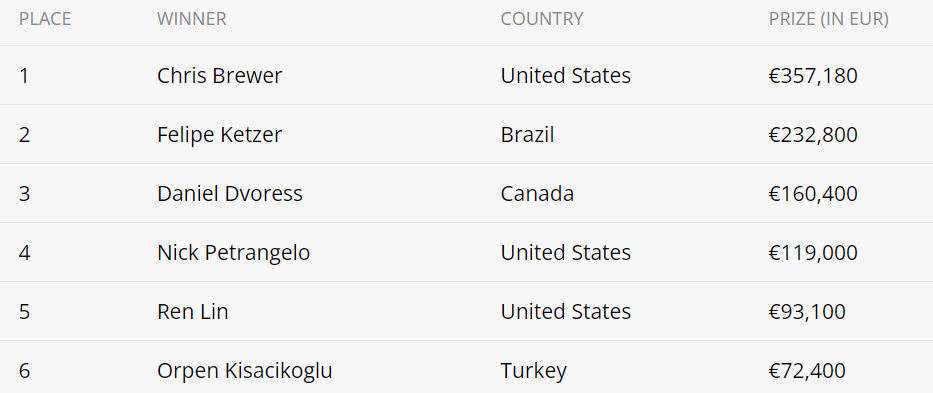 在经过15个小时的漫长奋战后,Chris Brewer在单挑中击败巴西选手Felipe Ketzer,获得冠军以及357,180 欧元奖金。