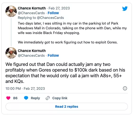 (推特内容:两天后,我在科罗拉多州的Park Meadows购物中心停车场的车里和Dan通着电话,而我的妻子正在购物中心里面参加黑色星期五购物活动。我们立刻开始研究如何对Gores展开剥削。我们得出结论:在预判之下Gores只会用A8s+、55+和KQs跟注全压,所以只要他开池到$100k,Dan实际上就可以用任意两张有利可图的牌进行全压。)