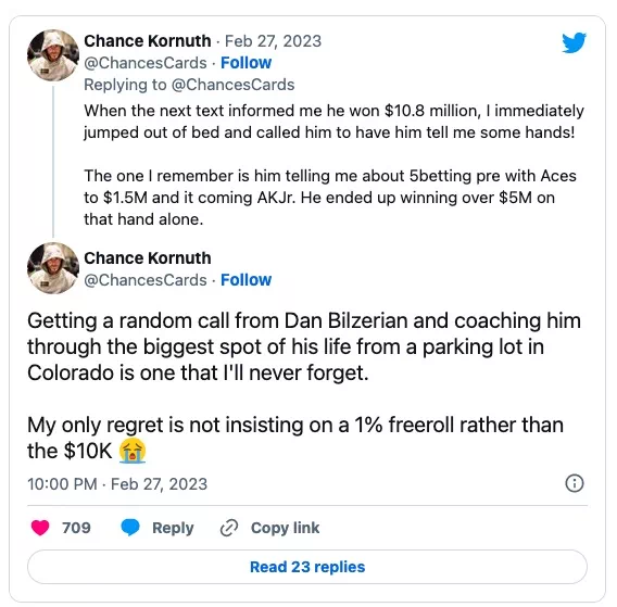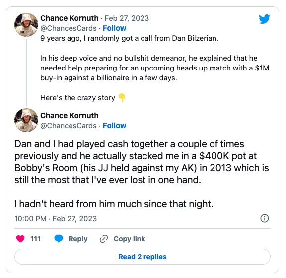 (推特内容:当我收到下一条信息时,他说自己赢得了1080万美元,我立刻跳下床给他打电话,让他告诉我一些手牌情况!记得他告诉我有一个底池,翻前他用A-A 5bet到150万美元,然后翻牌为AKJr。他单单在那一手牌中就赢到了500多万美元。接到来自Bilzerian的电话,然后在科罗拉多州的停车场中指导他如何剥削Gores,这是我永远不会忘记的经历。唯一的遗憾是没有坚持要求1%的指导报酬,10,000美元的学费太草率了。)