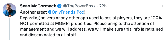 我很高兴地向大家报告,MGM度假村扑克策略主管Sean McCormack刚刚在推特上明确禁止现场RTA: