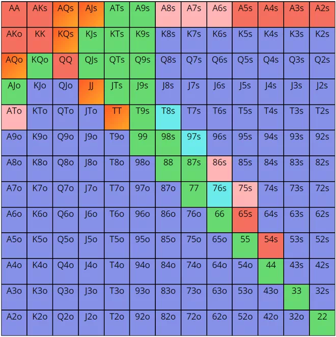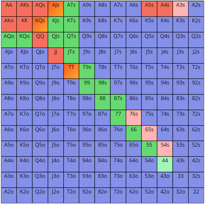 然后我们用Upswing Lab推荐的小盲位置对抗中间位置加注的范围估算小盲玩家的范围。(注意,这是一个特别粗略的估算,因为上面这手牌的小盲玩家不是冷跟注,而是随后跟注。)