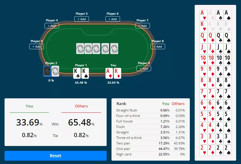 在我们的赔率计算器上,我们可以看到,在第一次翻牌前,Robl有33.69%的机会赢得彩金。第二个牌局的百分比更低,因为牌局中少了一张A: