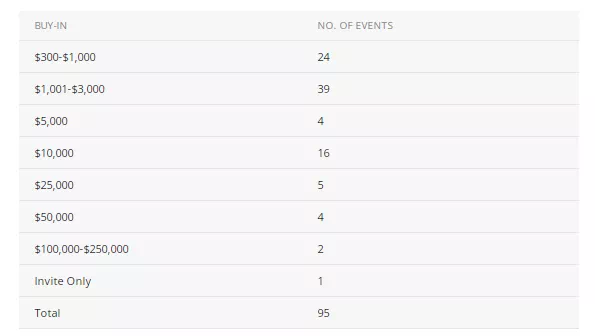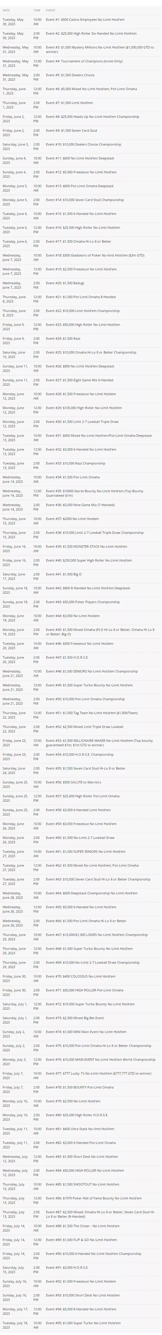 每日深筹锦标赛将再次从6月1日至7月17日每天进行,比赛从200美元到400美元不等。此外,每日大型卫星赛将从5月31日至7月14日举行,从135美元开始,最高为25,000美元。