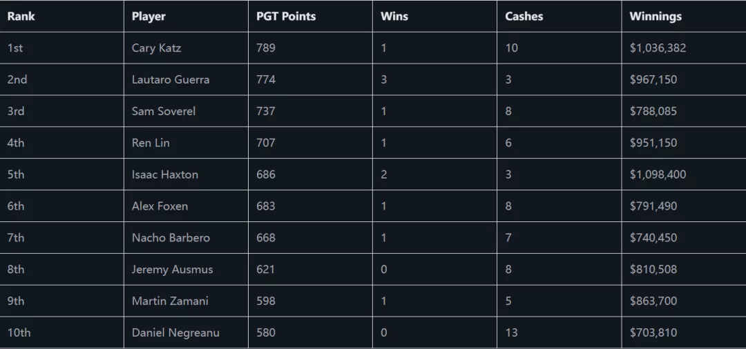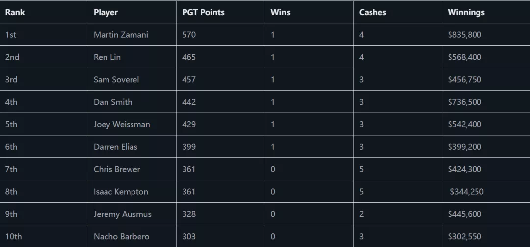 2023年美国扑克公开赛积分排行榜:
