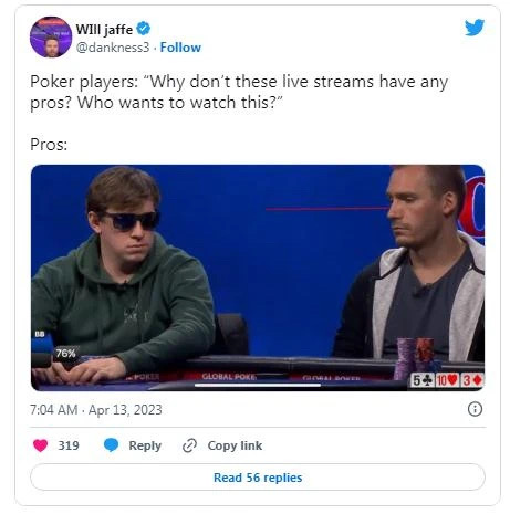 “我已经玩了22年的扑克了。我不会假装对玩你们的游戏有任何了解。然而,我很难相信像你们这么有经验的人不能在不放弃优势的情况下欢快地玩耍。也许我错了,”@LuxAeternaPoker在推特上对Dan Smith说。
