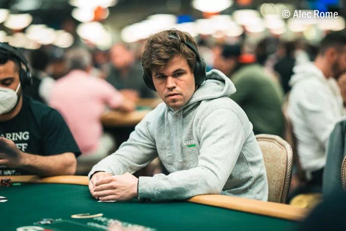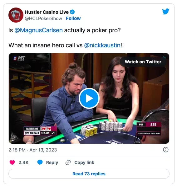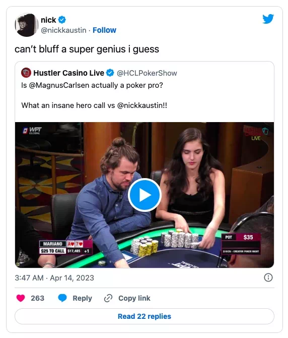 (推特内容:确定Magnus Carlsen不是职业牌手?这个跟注太老练了!)