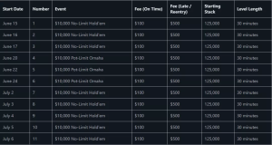 第一组3场无上限扑克比赛直接围绕着WSOP赛事#35:10,000美元NLH神秘赏金(6月14日开始)和WSOP赛事#40:250,000美元NLH扑克超级豪客赛(6月16日开始)进行。而另外3场PLO锦标赛直接围绕 WSOP的两场大型奥马哈锦标赛展开。