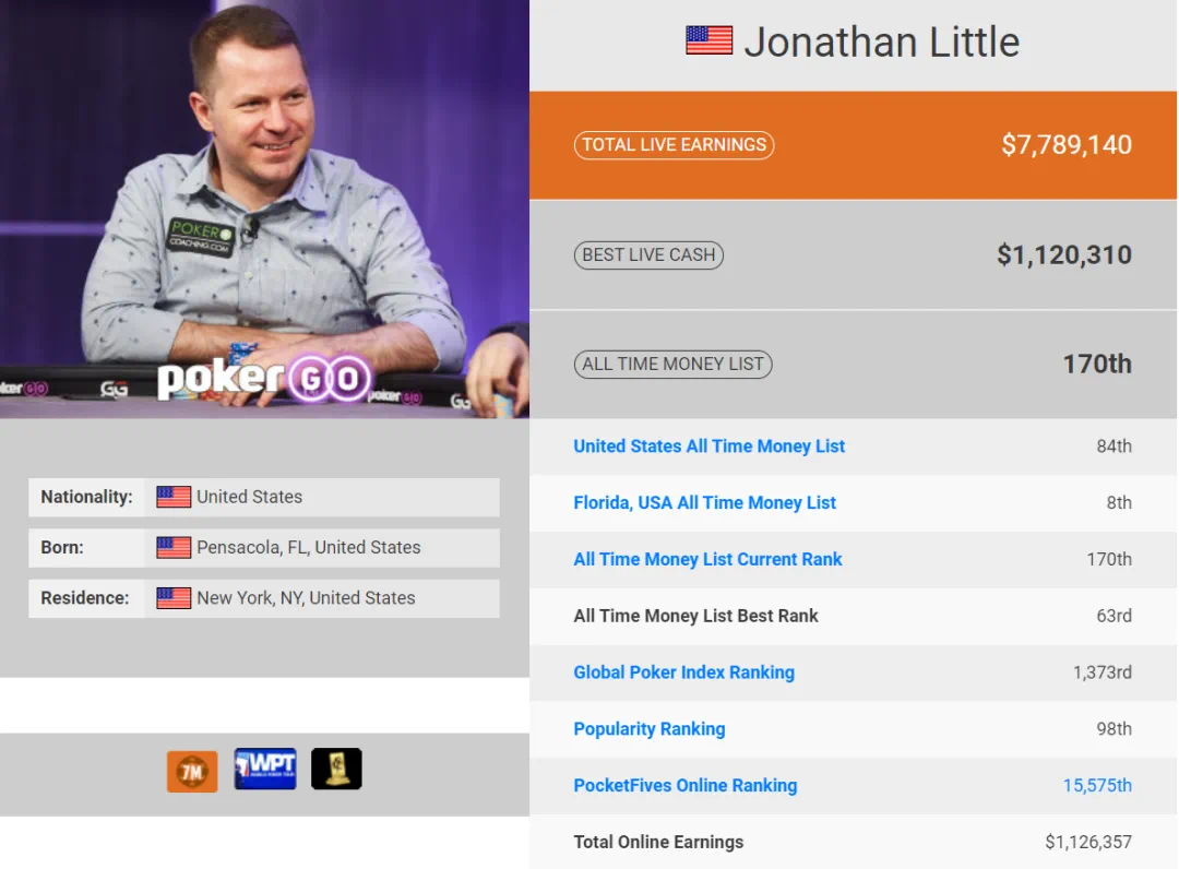 39岁的美国人Jonathan Little有着多重身份。他是一名优秀的职业牌手,也是一名资深扑克教练、作家、赛事评论员,更是2019年GPI扑克人民选择奖。WPT年度选手,曾两次获得WPT巡回赛冠军,生涯锦标赛赢利将近779w美元。