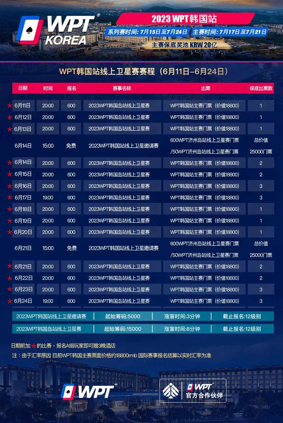 此次WPT韩国站主赛买入₩3,400,000 (约2,550美金 )国际赛事报名以实时汇率为准,保底奖金高达₩2,000,000,000(约150w美金)!