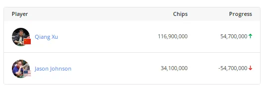 两人一定次关键的碰撞是在一个7♣3♣K♠Q♠的牌面上,Johnson过牌。徐强借此机会下注13,500,000。作为回应,Johnson全下,徐强断然跟注。
