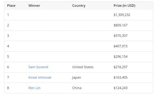 Ren Lin在当天比赛临近结束前倒在了第八名,奖金为124,243美元。香港选手Ka Kwan Lau则获得了第11名,奖金为75,352美元,Tong Li获得第94名,奖金16,088美元。
