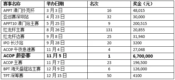 除WSOP主赛外,李远当年的剩余奖金都是在澳门所获(几乎都过6位数):