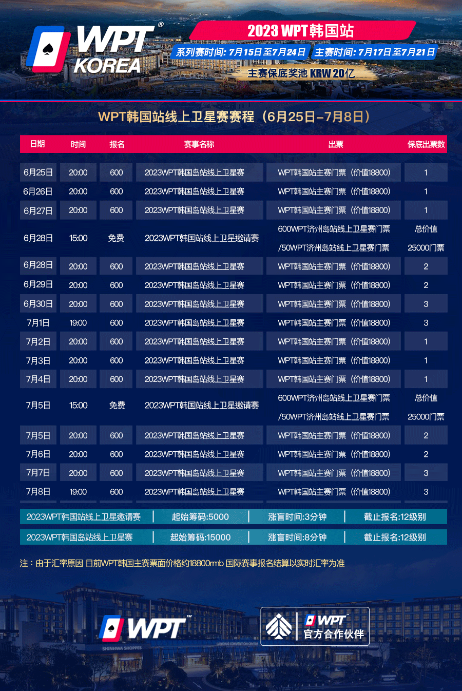 WPT韩国站主赛为7月17日~22日,总共有3天的Day1。主赛报名340万韩元,保底奖励20亿韩元,主赛将在全球进行中英双语视频直播。