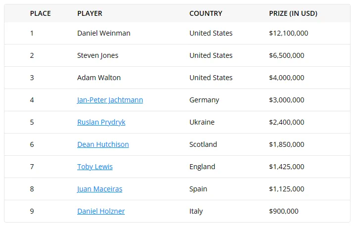 Weinman拿下梦寐以求的冠军。Steven Jones获得第二名,二者的奖金差距高达560万美金!