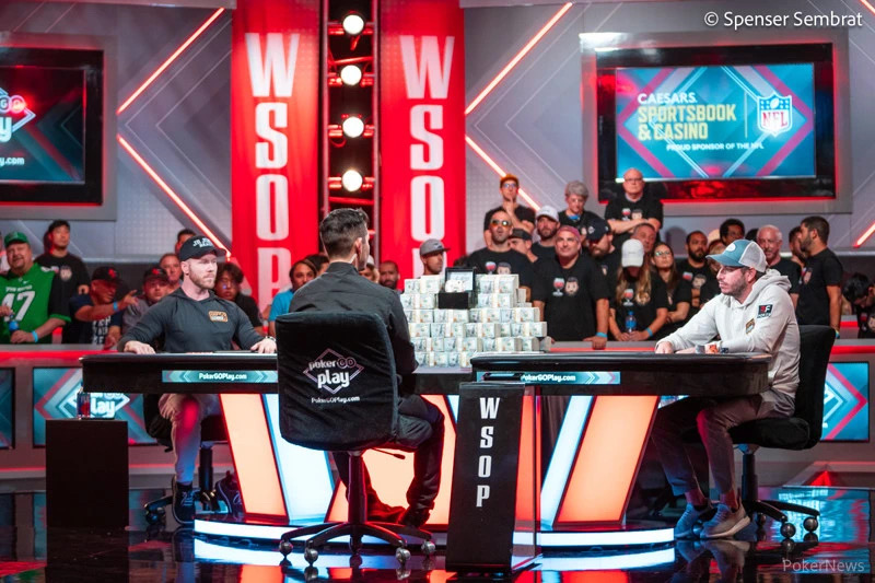 九人决赛桌在这两天举行,仅用了164手牌便结束了战斗。而在今天的三人争冠中,只打了48手牌。最后三位选手在比赛开始前,筹码量相差并不大,Steven Jones拥有238,000,000筹码,Daniel Weinman有199,000,000和Adam Walton有165,500,000。