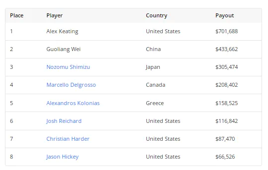 公共牌发出了3-8-6-7-K,Alex Keating胜出。魏国梁则收获了亚军,奖金为433,662美元。