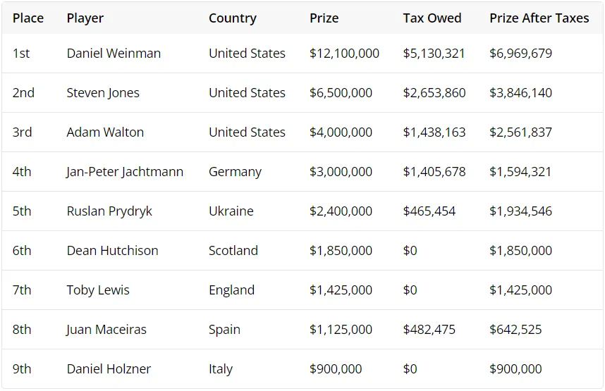 第五名的Ruslan Prydryk来自乌克兰。乌克兰对其征收18%的固定税率和1.5%的军费征税。这意味着他的奖金剩下的1,934,546美元,但也比Jan-Peter Jachtmann获得的第四名奖金高。