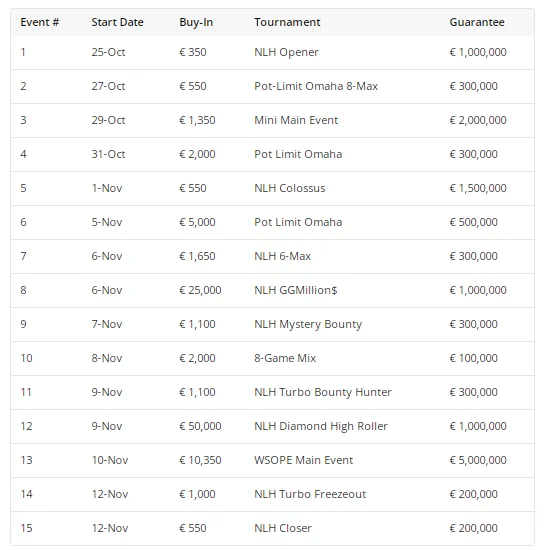 最受到关注的赛事当然是主赛事,这是一场10,350欧元的扑克锦标赛,从11月10日开始,保证金为500万欧元。去年的冠军是Omar Eljach,他获得了1,380,129欧元的奖金。