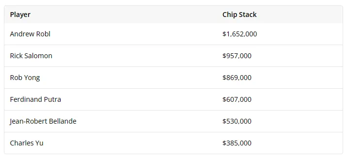 不过,节目开始时Persson并没有入座,不久之后才现身牌桌。摄像机开始拍摄时,牌桌上的玩家与上周相同:Andrew Robl、Rick Salomon、Rob Yong、Ferdinand Putra、Jean-Robert Bellande、Charles Yu。