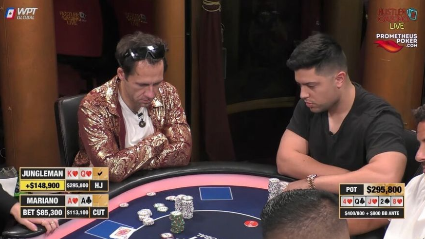 解说员思考到:“Mariano相信自己能够从这种劣质牌中获得价值吗?”Mariano的选择显而易见,他大胆地做出了全压,筹码量$84,400。Jungleman秒跟。