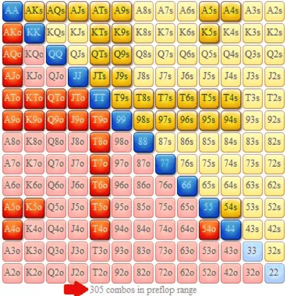 即使对手用AJ+及更好牌做价值下注,包括每一种可能的对子和大于33的口袋对子,也只能找到305种可能的价值下注组合: