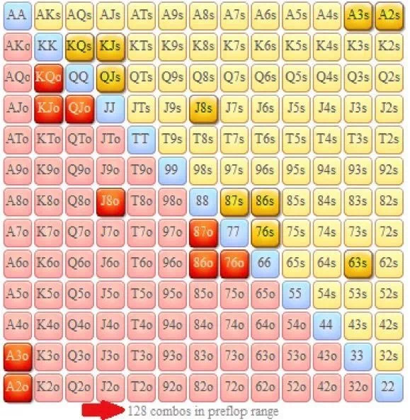 (红色方格代表对手在T ♥ 4♦ 5♥ 9♦公共牌面可能的价值下注牌。)