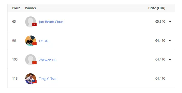 而Jun Beum Chun,余磊,Zhewen Hu和Ting-Yi Tsai等四位华人选手打入了奖励圈,拿到了奖金。