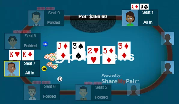 小盲玩家全压剩余67美元,中间位置玩家用A♦ Q♣跟注,然后小盲玩家亮出了K♥ K♦。最终小盲玩家赢得了这个巨大的底池。
