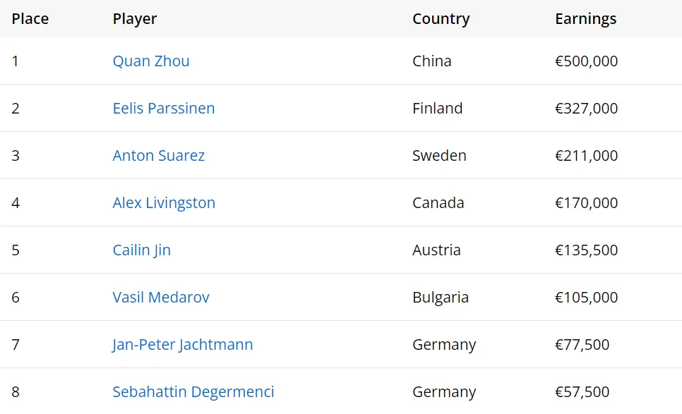 两位选手的较量精彩绝伦,Parssinen在开局时的记分为12,70w,而周全则是940w。Parssinen展现出了极具攻击性的实力,一度将周全的记分压到了不足400w。不过,周全通过一次成功的诈唬扳回一城,并在接下来的比拼中连续获得几个底池,逐渐占据了领先地位。在最后一手牌中周全击中同花,成功逆袭英勇夺冠,奖金50w欧元!这是周全职业生涯的第二高奖金,也是他首次在亚洲以外的现场锦标赛中获胜!凭借这场胜利,他的现场奖金总额超过了400w美元。在拍完冠军照片后,他又投入到了同时举行的€10,000白金豪客赛中,恭喜周全!希望他在接下来的比赛中再创佳绩!比赛结果: