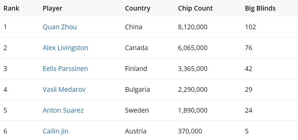 经过多轮淘汰,Day3决赛日的桌上仅剩下三人。芬兰选手Eelis Parssinen成为首个记分突破10,00w的选手,领先其挑战者两倍以上。他将瑞典选手Anton Suarez击败后与周全进入单挑对决。