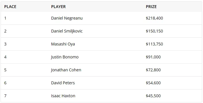 Daniel Smiljkovic与对手相比筹码少了约两百万,但作为赢得这手的巨大热门,他毫不犹豫地选择跟注。但是河牌是Q♥,Daniel Negreanu击中顺子,将比赛结束于凌晨2点左右。亚军获得了150,150美元,而冠军则带走了218,400美元。