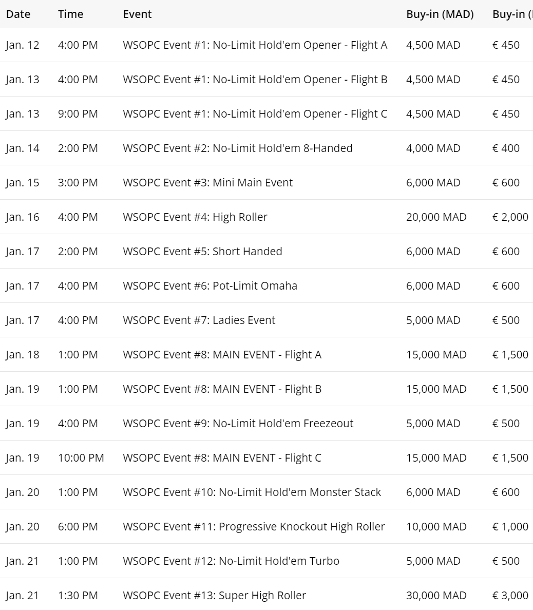 2024年WSOP巡回赛马拉喀什赛程: